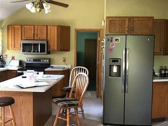 Unique 3 bedroom, 2 bath home with octagon skylights, ceiling to floor fireplace with heaters, kitchen island, newer kitchen cupboards, newer appliances, patio, railroad ties, rocks, retaining walls, landscaped, economical heating, 12' cement walls. Barn with 20' x 24' loft and workshop. It's a must see!