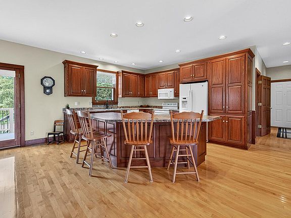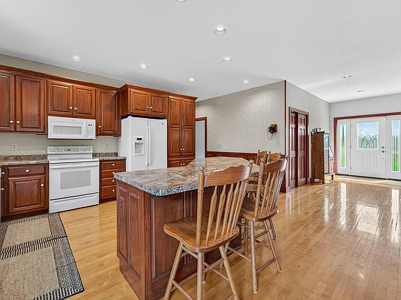 Beautifully maintained 4-bed, 3-bath open-concept ranch on 1.6 acres with a private pond. Main floor features hardwood floors, fireplace, large windows, and seamless flow from kitchen to living areas. Finished walkout basement includes guest suite, extra living space, and access to backyard. Enjoy peaceful views from the large deck. Includes 3-car garage, main-level laundry, luxurious primary suite, new roof (2024), and bonus 800 sq ft storage/workout room under garage. Low taxes and great location!