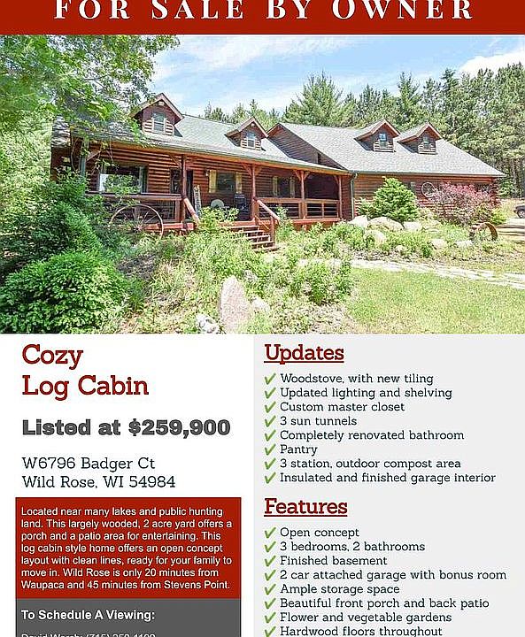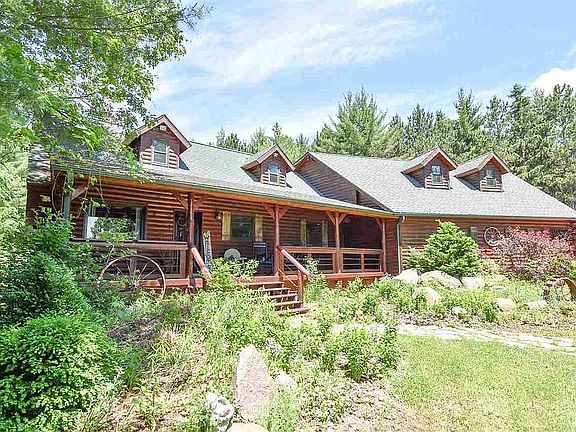 This is a gorgeous log home, located along a peaceful, country road on the outskirts of Wild Rose. With a beautiful blend of the rugged cabin feel and the beauty of sleek modern lines, this home is sure to please the most discriminating buyers. The interior of the home boasts 2 story tall cathedral ceilings and an open loft on the second floor. There is a large, fully finished basement that includes a large laundry and storage room, along with two smaller storage rooms to help hold all the holiday decor that you can find. There is a three section composting area, to help you maintain the beautiful gardens surrounding the home. The front and rear covered porches offer views of the deer and turkey that frequent this yard along with the gardens, and towering pines surrounding this property. This home is also located near many lakes, thousands of acres of public hunting land, and just a few miles from Nordic Mountain Ski Hill. Homes located in areas like this with these qualities do not stay on the market long, so make an appointment to see this one before it is gone.