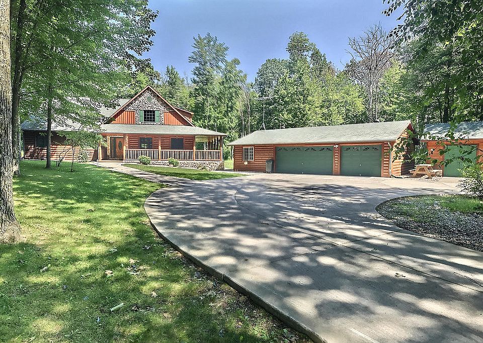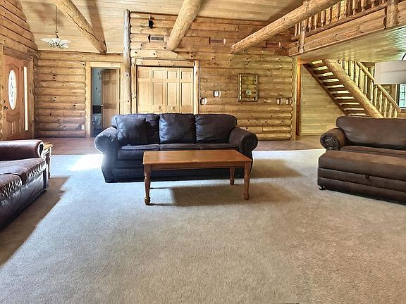 Crivitz 3 bedroom, 2.5 bath home near Lake Noquebay! Stick built home by Lake Construction with log siding and log interior. Warm and inviting, this property features open concept living and lots of space. Massive stone fireplace in large living room with high cathedral ceilings and log beams. Kitchen with appliances and stone-faced island. Owner's suite with walk-in closet, full bath with jet tub & deluxe walk-in shower, & a private loft. Main-floor bedroom & laundry and additional loft bedroom. Heated floors in lower, plumbed for bath. Wrap-around porch. Beautifully landscaped with concrete sidewalks, patio with firepit. 3-car detached garage with insulated workshop. 12x12 shed. Additional land available.