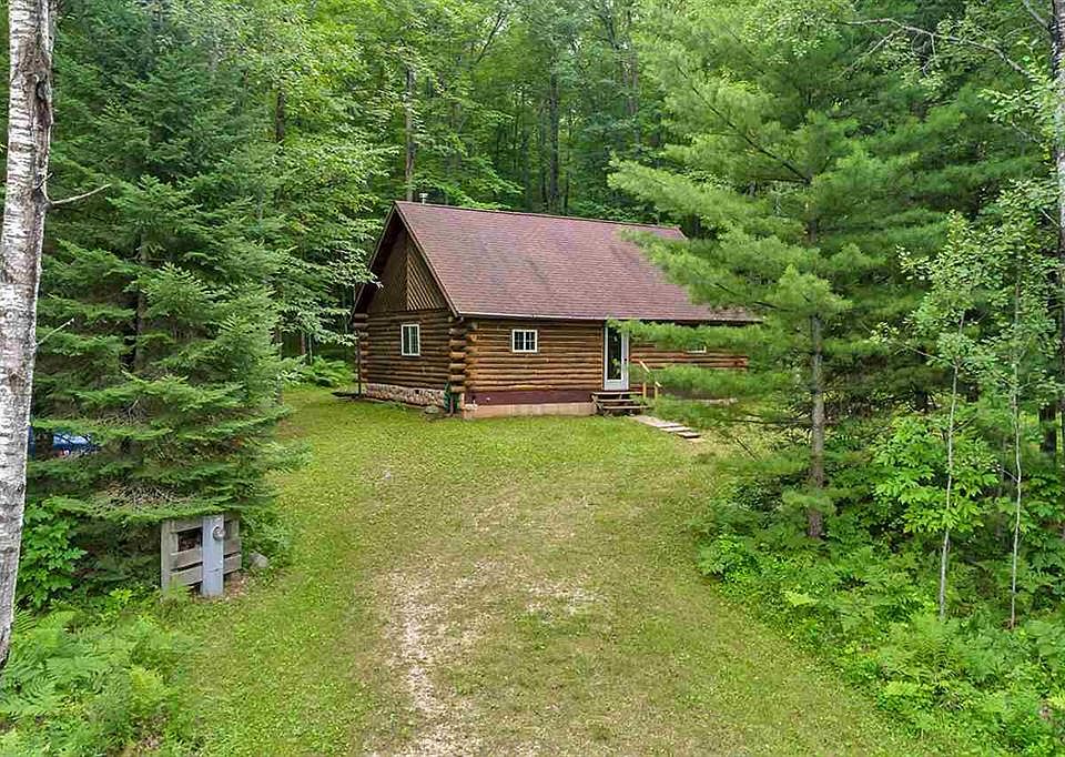 Private 4+ wooded acres. Updated "log cabin in the woods" offering an open concept feel w/rustic pine tongue & groove ceiling, exposed log walls and hardwood flooring. Cozy wood burning fireplace, skylights for natural light and glass doors to patio. Applianced kitchen w/hickory cabinets, snack counter & pendant lighting. 2 main level bedrooms + full bath. 10x20 detached storage building w/electric. Updates include: bath & kitchen remodel, new shed, patio, bedroom carpet and kitchen snack counter. Close highway access. On ATV/Snowmobile trails. Excellent Hunting. Located near several lakes