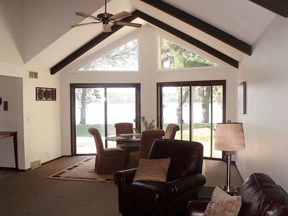 Two bedrooms on main floor, main bedroom on upper. Cathedral ceilings in living/dining and main BR. Nicely finished basement area with natural stone fireplace, bar. Neighborhood Description House is located on a single dead-end road. Triple lot in front of house is privately held by the homeowners on the road and available for picnics, etc. Unique architectural design includes no windows to the west or east, allowing privacy. Six double patio doors on the north and south plus main BR allow natural light to flood the house. Pier and waterbike available. The lake, Potters, allows swimming, water skiing, fishing. Located 2 miles from East Troy Airport.