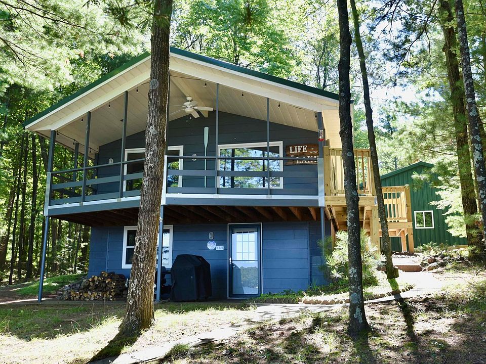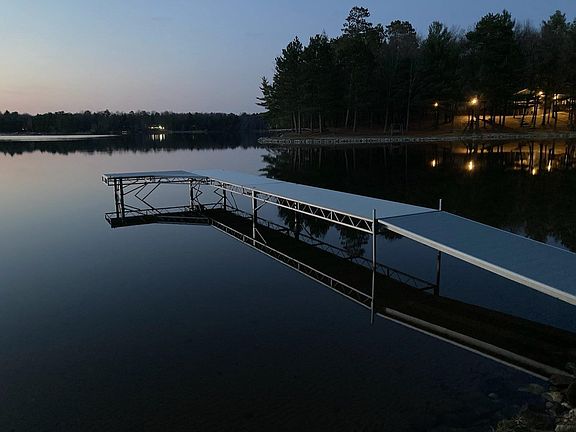 Outstanding lake view, adorable 2 bedroom cottage with a new metal roof, new gutters, new pole barn/garage, remodeled bathroom, new well and septic, new deck and new dock. Set deep off of V V with a turn around driveway, this main lake home on Legend Lake has an amazing 24' x 11' deck to sit and watch sunsets, enjoy your morning coffee and watch endless hours of lake activity. Situated on one of the main lakes in the chain of lakes system, you have immediate access to year round activities. A large garage gives you room to store all sorts of lake toys and winter toys. Lower level family room area floor is currently concrete. What will you put down there to serve your needs?