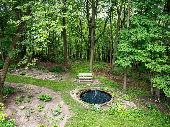 The spacious, finished, and insulated garage is a highlight, offering plenty of room for vehicles, tools, and additional storage, making it ideal for hobbyists or anyone who needs extra space. Outside, the deck provides a serene spot to overlook the private backyard, which is beautifully landscaped with lush perennial beds and a tranquil pond featuring a soothing fountain. The backdrop of the forest adds an additional layer of privacy and natural beauty, creating an inviting outdoor oasis. Long range views in the winter months add variety to your year round experience in this home.