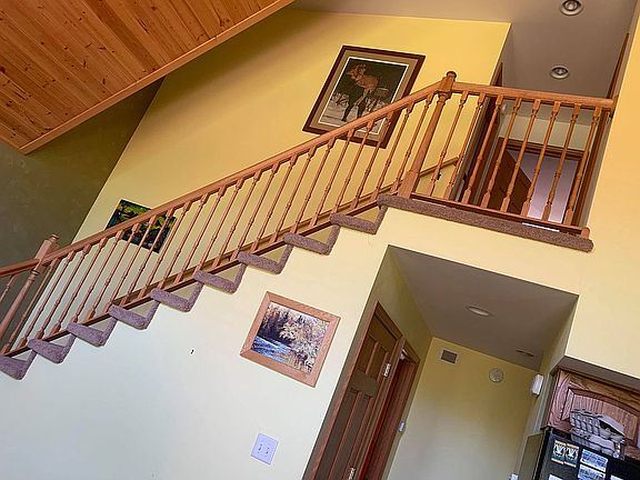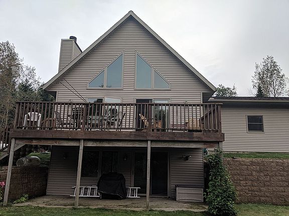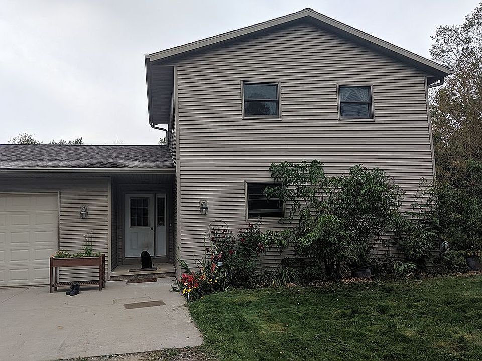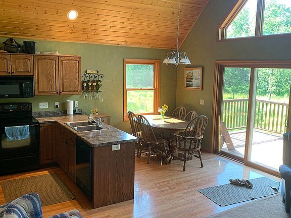 UPDATED LISTING PICTURES. Great location for a cabin or year-round home! This home was built in 2007 with 2x6 exterior studs. The great room has cathedral ceilings and trapezoidal windows, with a high-efficiency fireplace that overlooks the wildflowers, and back yard with a deck. Although the house has forced-air heat, the fireplace heats the house comfortably. The basement has a walk-out patio door and concrete patio. There's a 2+ car attached garage for vehicles and toys. The master bedroom includes a master bath and double sink with shower tub. There's main floor laundry and wood floors. There are two bedrooms upstairs with a full bath. The exterior is vinyl siding with gutters and downspouts. The lawn was planted with a no-mow lawn seed mixture. The septic system was planted with native prairie plants to minimize maintenance and maximize the life of the system. The LP tank is owned by the homeowner. Dogs love the location and house. The house sits on two acres, a dead end road, and is 200-feet away from 1000's of acres of public land.