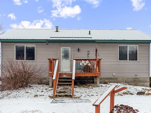 Just what you've been looking for! Cute 4 bedroom country home on 5+ acres with a heated 2+ car garage with lean to and a poleshed for animals or hobbies! 3 year old furnace, 6 year old metal roof, insulated chicken coop- all outbuildings have electric, mature apple trees and entire property is fenced for animals. Nice big deck on the house, SS appliances, gas stove, walk out lower level.
