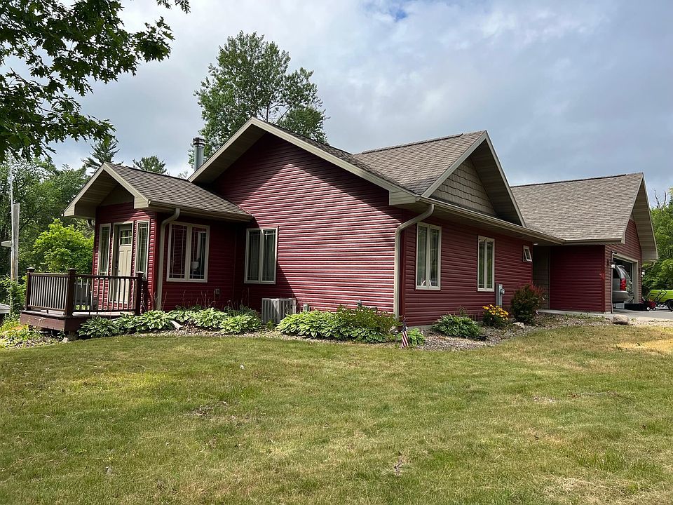 So much potential in this 2-bedroom property that's less than 10 years old! Tucked in on 2.79 wooded acres, 600+ feet of frontage on the South Branch of the Oconto River, near the Nicolet National Forest and more. A little work will uncover beautiful landscaping including stone & stamped concrete which makes for an amazing view overlooking the water. Open concept kitchen with island leads to living room with vaulted ceilings, wood beams, wood burning fireplace and cozy 4 season room. Large patio with fireplace would be a great location to relax at the end of the day. Spacious 3 stall garage with 2 doors and access to full, unfinished basement that's awaiting finishes! Property is being sold as is.