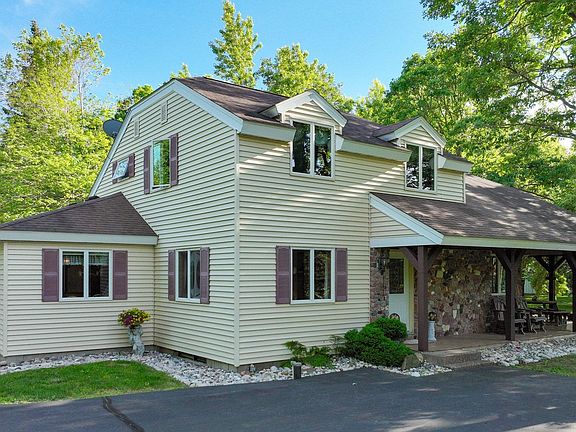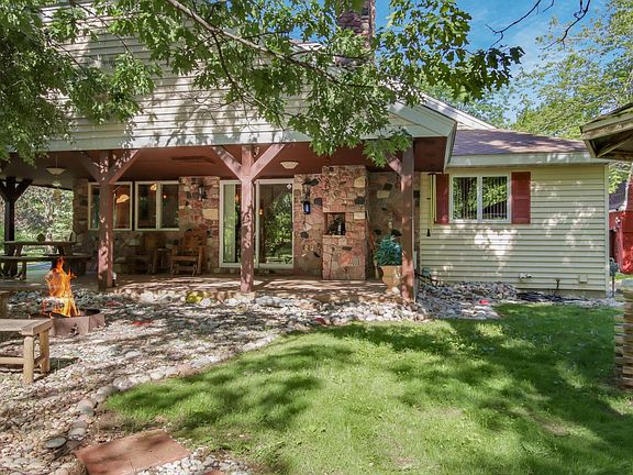 A beautiful gem in Ladysmith has just hit the market, offering a prime location nestled by a serene pond. This charming 1.5 story home stands out with its unique floor plan, featuring a balcony that overlooks a cozy living room accented by a rock-faced fireplace. The home includes a covered patio with a built-in firepit area and a versatile four-season sunroom. The spacious eat-in kitchen is complemented by a formal dining room, and the house boasts three bedrooms on a single level. The partially finished basement includes a full wet bar, and the outdoor space features a grill and ample storage above the porch. Recent updates include a brand-new septic system (May 2024), a new sump pump and piping (2022), new windows (2015), a new electrical panel (2021), dish washer (2023) and well updates (2021). The property also includes a detached two-car garage with a full staircase leading to a play area or studio. Three heat systems in place, ensures comfort regardless of power situations.