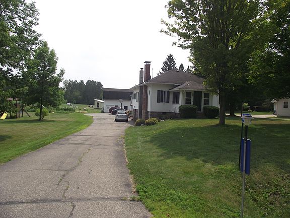 A 2 story with mostly finished walk out lower level tongue and groove walled family room and 4th bedroom/guest room! A 2 car garage and barn too! Lower level utility room as well a a root cellar storage room. Forced air, furnace and wood stove that heats up the whole place! Stone fireplace in the first floor living room with bedroom off that room too. Front porch and back deck with retractable awning area (access through kitchen patio door. Bedroom off the kitchen and large 2nd floor bedroom. Attic storage area. Barn with loft and 1 car garage area in the back yard with 5 acres for a mini farm if need be! Large garden area, fire pit, and wood swing set play fort for the kids or grand kids! Rock gardens surround the place with beautiful perennials! Strong well pump and newer septic system work great! Water lines added to the garden areas, apple trees and the field beyond!
