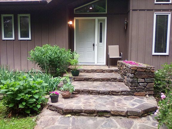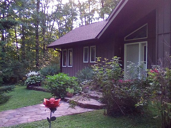 Meticulously maintained home in secluded/wooded setting on approx. 5 acres. Quality built to include Pella windows, Kohler/Moen fixtures, custom woodwork and cabinetry. Open-concept living/dining with vaulted ceiling and open staircase. Large master suite, with jetted tub and balcony. Huge walk-in closets. Family room with bar sink and cabinetry. Designer touches throughout home. Poured basement. Newer roof, furnace, A/C, and water system. Three furnaces (2 propane and 1 wood). New water heater. Home has steel siding, as does the 30 x 40 shed (with cement floor). Stone outdoor sidewalks and steps. All measurements are approximate.