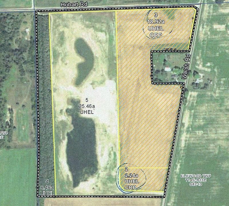 56 acres of land on the corner of Hobart & Walsh Rd. 2 driveways. One on Walsh Rd & one on Hobart Rd. 2 large ponds on property from old gravel pit. 21 acres on the East side in CRP program. Small amount of trees on the west side of property.