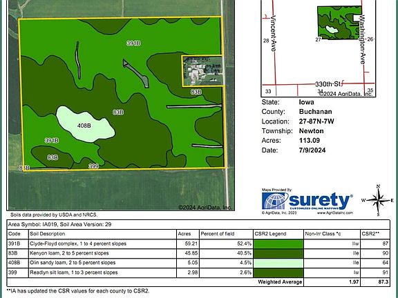 This is a high-quality Buchanan County farm with an 87.30 CSR2 on 113.09 cropland acres. Primary soils are Clyde-Floyd and Kenyon.