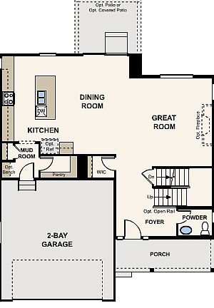Two-Story ; 2 Bay Garage with Entry ; Foyer ; Mud Room ; Open Kitchen with Island, Pantry, and Dining Area ; Great Room ; Main Level Powder Bath ; Second Floor Primary Suite with Bath and Oversized WIC ; Two Secondary Bedrooms Share Full Bath ; Second Floor Laundry ; Standard Unfinished Basement