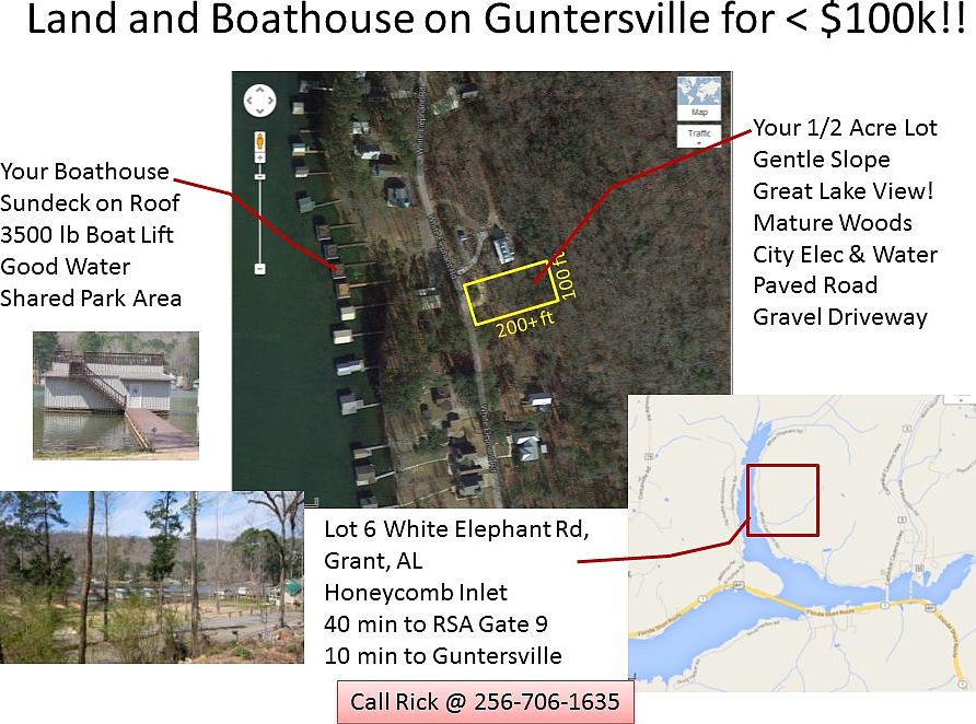 Lake Guntersville Water Access Lot and Boathouse. 1/2 Acre Water Access Lot 6 on quiet White Elephant Rd right across the street from the Honeycomb Inlet of Lake Guntersville (see the map). Honeycomb Inlet is a calm part of the lake which makes it a great place to waterski, jetski or fish! Easy access to the full lake through the 431 bridge. Only minutes from the dam. Gentle Sloping Lot perfect for a lake view from your front porch or living room. Great Lake View (check out the video)! Mature Trees. City Elec & Water available. Paved Road in front of the property. Gravel Driveway already in place. Brand new composite decking on boat house upper deck and pier. Recently added gravel walkway to the pier. Includes 9' x 25' Boatslip equipped with 3500 lb lift ready for your pontoon or bass boat. Shared Common Park Area. 10 min from downtown Guntersville on Hwy 431. 30 min from downtown Huntsville. 40 min from Redstone Arsenal Gate 9 on Hwy 431. $99,000 (no RE agent, my closing attorney price). Price is $104,000 if using a real estate agent.