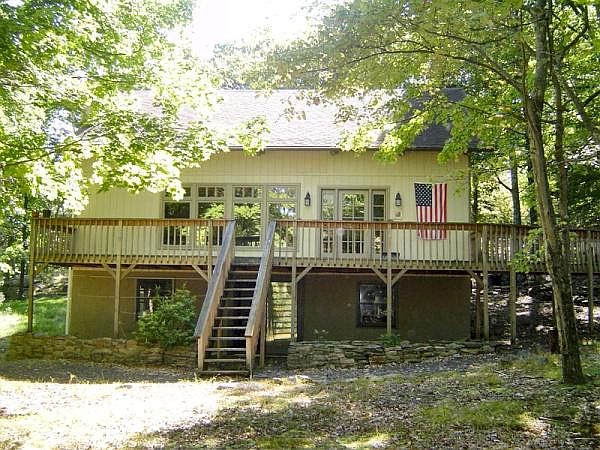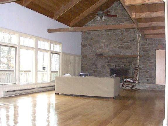 Country Charm4 bedrooms, 2 baths, full basement, & Pocono room on over 1 acre. Wooden floors throughout the house. Spacious living room with vaulted ceilings and a nice stone fireplace.