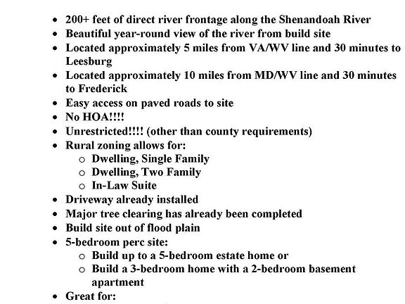 Wow!!! This is a once in a lifetime opportunity to own 1.4125 acres with 200+ feet of direct river frontage on the Shenandoah River with a gorgeous building site out of the flood plain! NO HOA and NO RESTRICTIONS (other than county requirements); 5 miles from the VA/WV line and 10 miles from the MD/WV line with easy access on paved roads; rural zoning allows for: Dwelling, single family; Dwelling, two family; and in-law suite. Property has a 5 bedroom perc site so you can build a fabulous 5 bedroom estate home OR a 3 bedroom home with a 2 bedroom basement apartment. Land lays so it may be possible to have ground floor entrance to basement and a ground floor entrance to the first floor. Great location and site for personal camping, your new homesite, or AirBNB. Schedule your visit today!!!