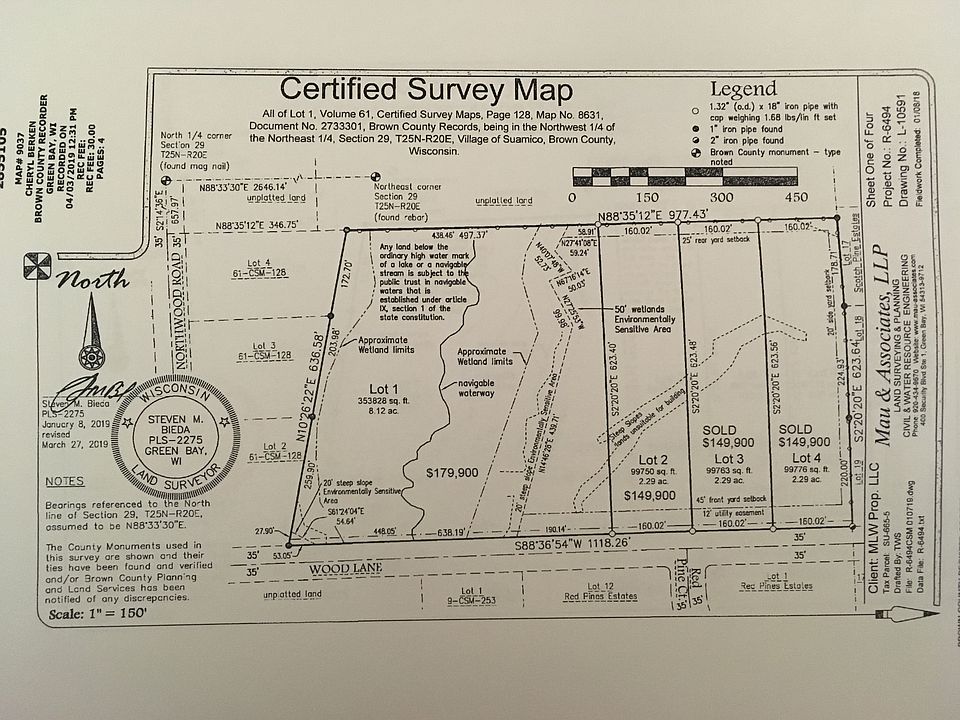 8.12 Acre lot in prime Suamico location. 4 miles off I-41. Wooded with large building area. Perc is for conventional septic.
