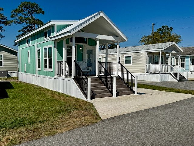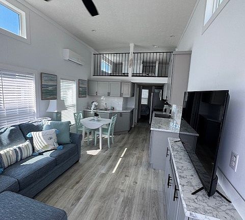 This beautiful brand-new Loft Bungalow Park Model is a popular and beautifully crafted unit featuring a dining counter, wet bar, and entertainment center! It features a stunning full width entry staircase, leading to the 8' covered porch, which is perfect for year-around enjoyment! This home is situated in a prime "center of the park" location for easy access to the heated swimming pool, pickleball court, putting green and fitness center. This is modern Florida living at it's finest without breaking your budget! Come and see for yourself today!