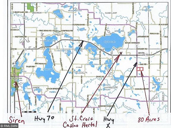 Incredible 80 acre parcel just East of Siren. This property offers trail for getting around the property. This offers fantastic deer and Grouse hunting. Several great cabin locations. This property is only 3 miles from the Casino and 15 minutes to Siren. There are plenty of lakes in the area for fishing!! Less than 1/2 hour to shell Lake and less than 2 hours to the Twin Cities!!