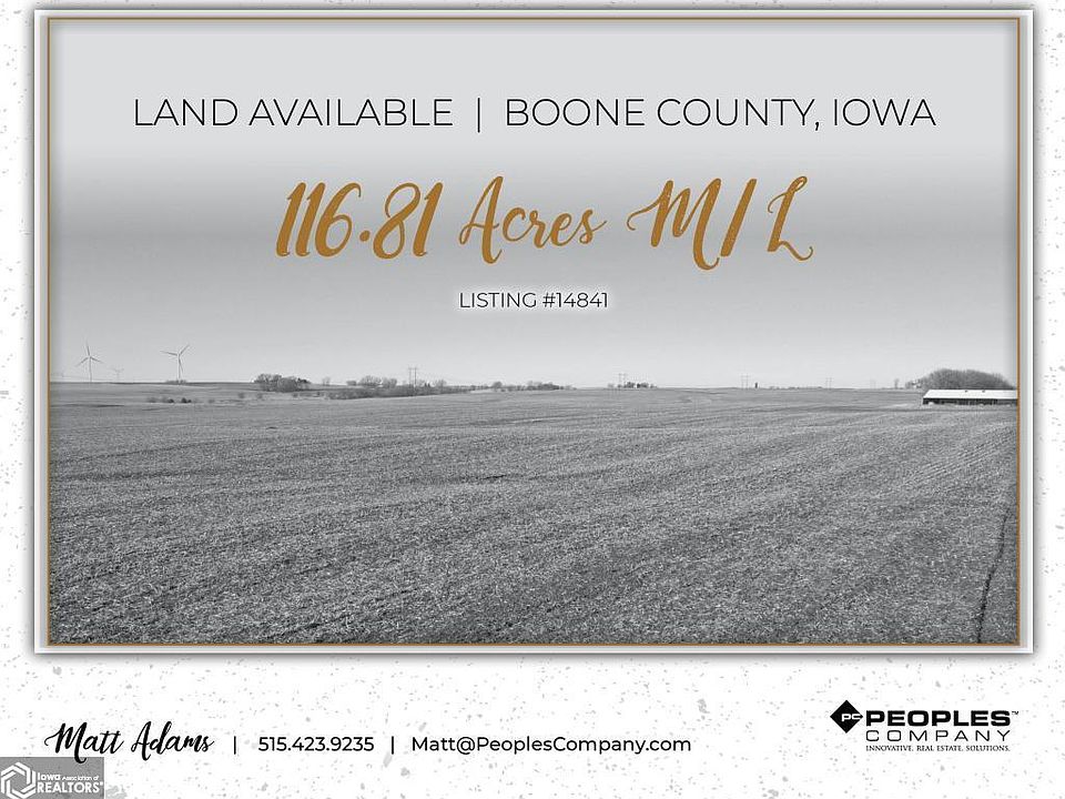 Here is your opportunity to own Boone County, Iowa farmland! The property consists of 116.81 acres m/l with 114.54 tillable / farmland acres with a CSR2 rating of 81.5. Primary soil types include high-producing Clarion loam and Webster clay loam. There are drainage intakes located on the farm but the amount and size of drainage tile is unknown. Conservation measures have been actively applied with well-maintained waterways designed to preserve topsoil from moving water. In addition, there are 2.63 acres enrolled in the Conservation Reserve Program (CRP) through September of 2027 with an annual payment of $994 or $378 per acre. The CRP practice these acres are enrolled in is the Grassed Waterway or CP8A program. Highlights of the area include several grain marketing options located nearby including a POET ethanol plant located north of Gowrie, Iowa offering competitive bidding. There is a farm lease in place for the 2020 farm year. Contact agent for farm lease details.