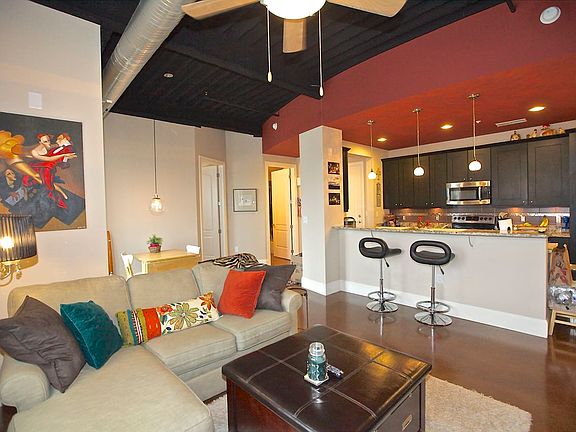 Sought after NoDa Arts District mid-rise with Amalie’s Bakery right outside your front door! Great location, great top floor 2 BR, 2 BA condo with true urban appeal. Great city skyline views and photogenic western sunsets from your personal private terrace balcony. Exposed 12 foot ceilings, 8 foot bedroom doors for privacy, plus attractive stamped concrete floors. Large walk in closets in both bathrooms. Granite counters in kitchen and baths. Awesome kitchen space with seated counter area – gorgeous cabinets and stainless appliances. Designer lighting. Secured building. This home comes with one reserved parking space, a premium spot, right at the front door.