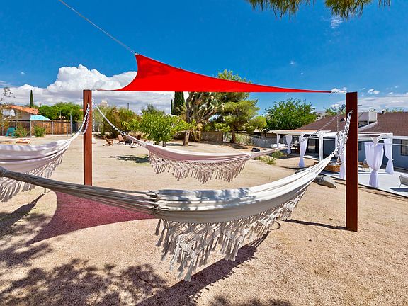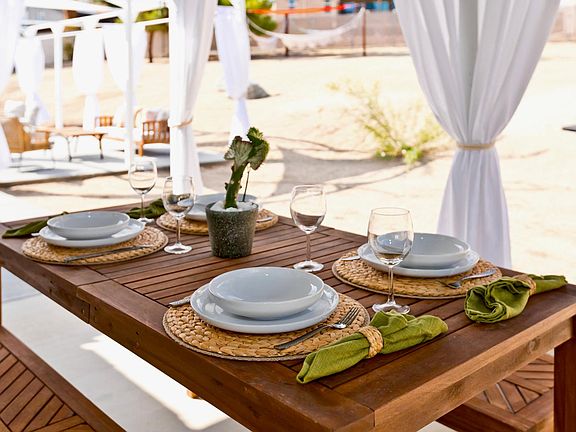 Enjoy cozy Boho Chic vibes throughout the house. Every detail was thoughtfully designed to create an exciting space that is pleasing to the eyes while providing a comfortable and relaxing atmosphere. Whether you come to Joshua Tree to soak in the desert sun or stargaze at night, the Desert Dream Oasis house is perfectly setup to help you experience it all. Take a nap on the hammock, play a few games of corn hole while you wait for the grill to fire up, enjoy a meal under the shaded patio and evening drinks on the luxurious cabana. At night, you can relax by the fire pit or unwind in the 6-person hot tub.